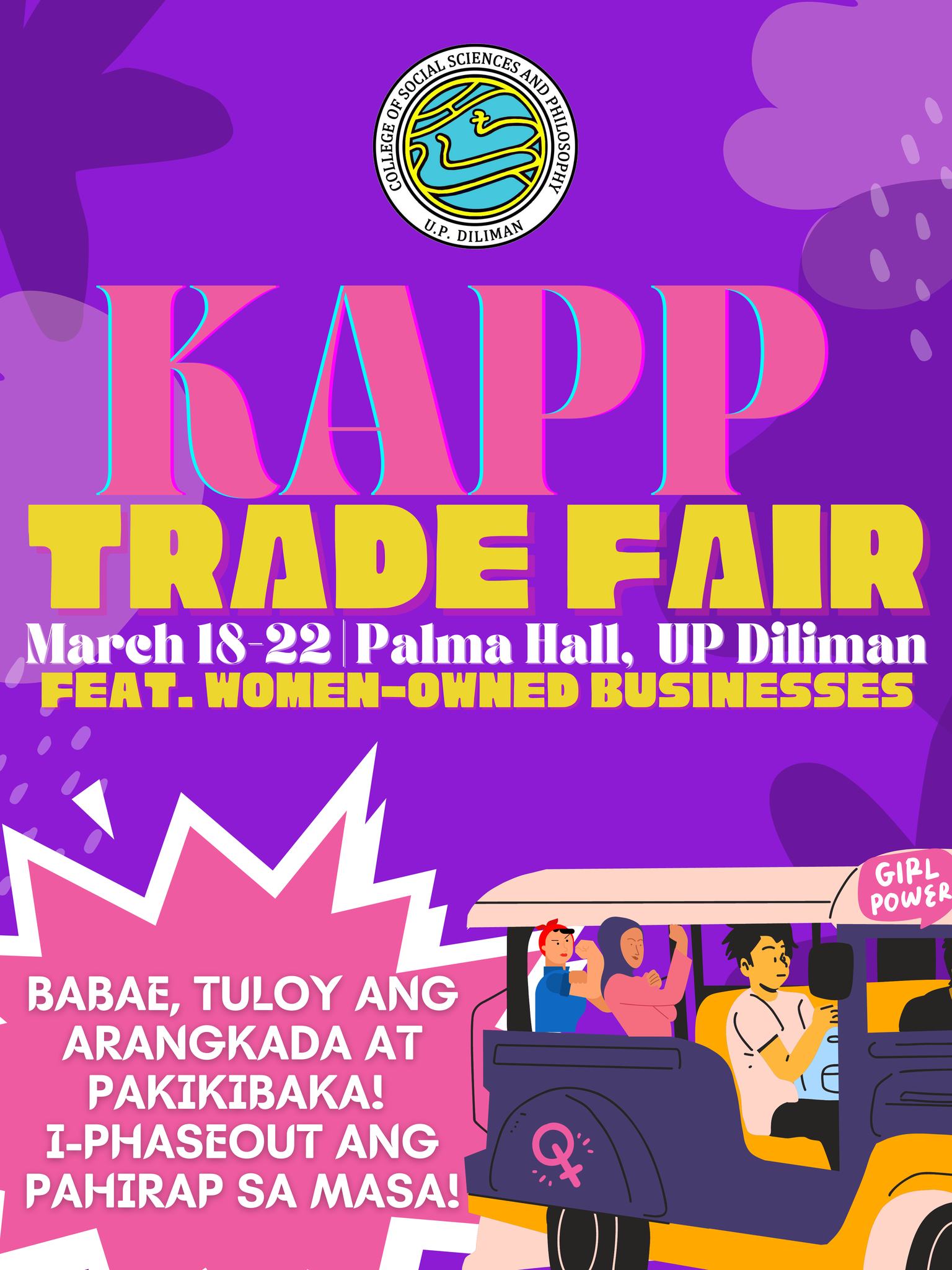 ABANTE BABAE! Bilang pakikiisa sa Buwan ng Kababaihan, iniimbitahan ang lahat sa gaganaping Trade Fair ng Kolehiyo ng Agham Panlipunan at Pilosopiya (College of Social Sciences and Philosophy) simula Marso 18 hanggang 22, 2024, 8AM-5PM, sa Palma Hall lobby…